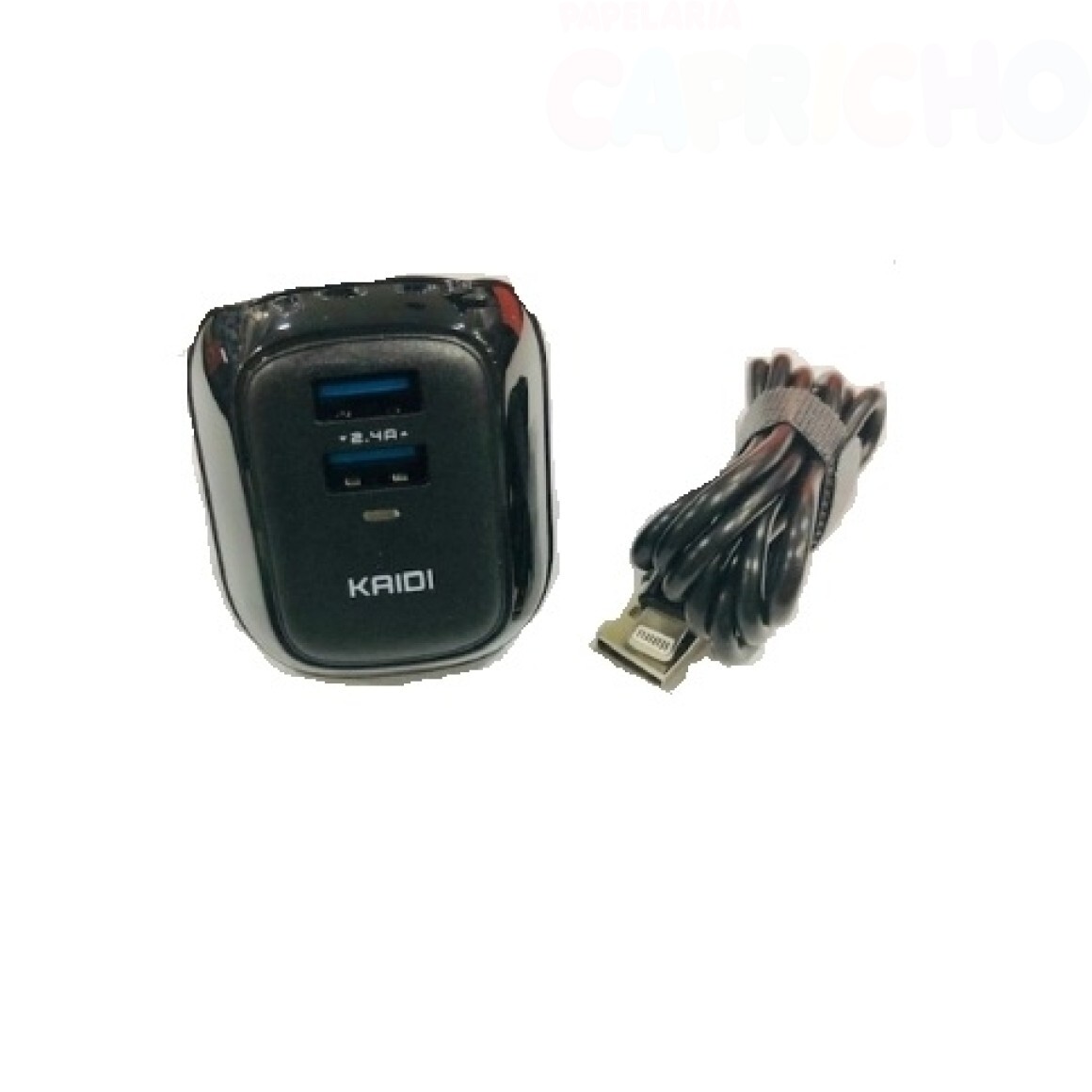 O KAIDI Home Charger AUTO-ID 2.4A (Max) 12W AC Adapter with Lighting to USB Cable KD-85A Preto é um carregador turbo duplo com um cabo Lighting incluído para carregamento USB adaptável até 2.4A em ambas as saídas USB atingindo assim um carregamento mais rápido para o seu celular, incluído Apple iPhone, ou tablet, incluído Apple iPadComparado com um carregador comum 1A (comum ser entregue com todos os iPhones e Samsung linhas A e J) teoricamente é 2.4 vezes mais rápido por ser turbo adaptávelÓtimo para carregar em casa ou para viagem por ser 5V e é bivolt compatível com tomadas de 100V até 240V.