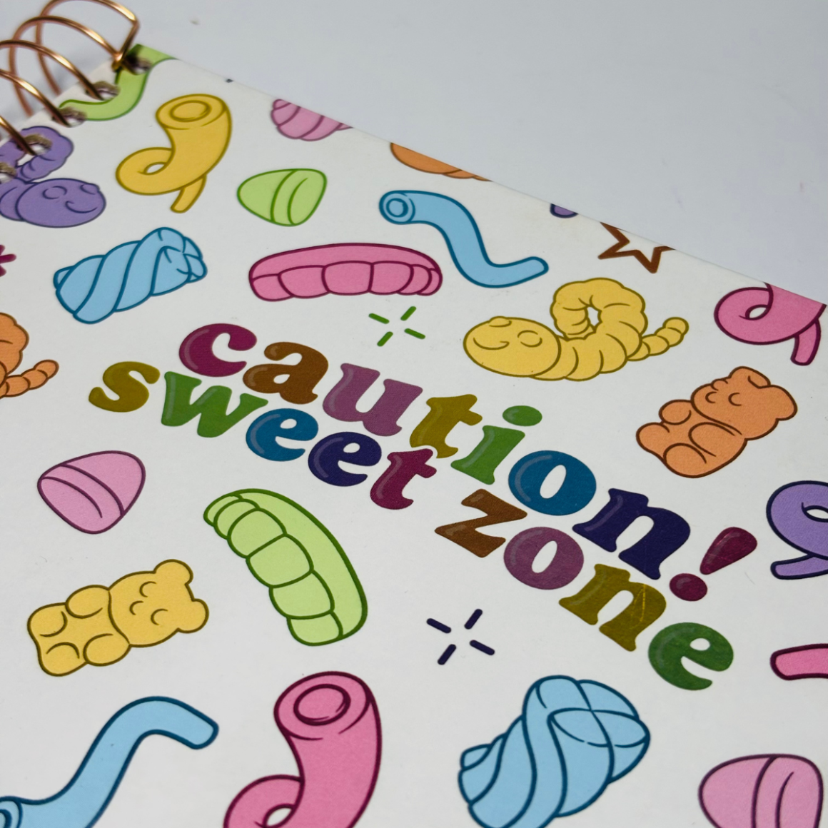 Capa dura estampada com balas Fini – tema “Caution! Sweet Zone”