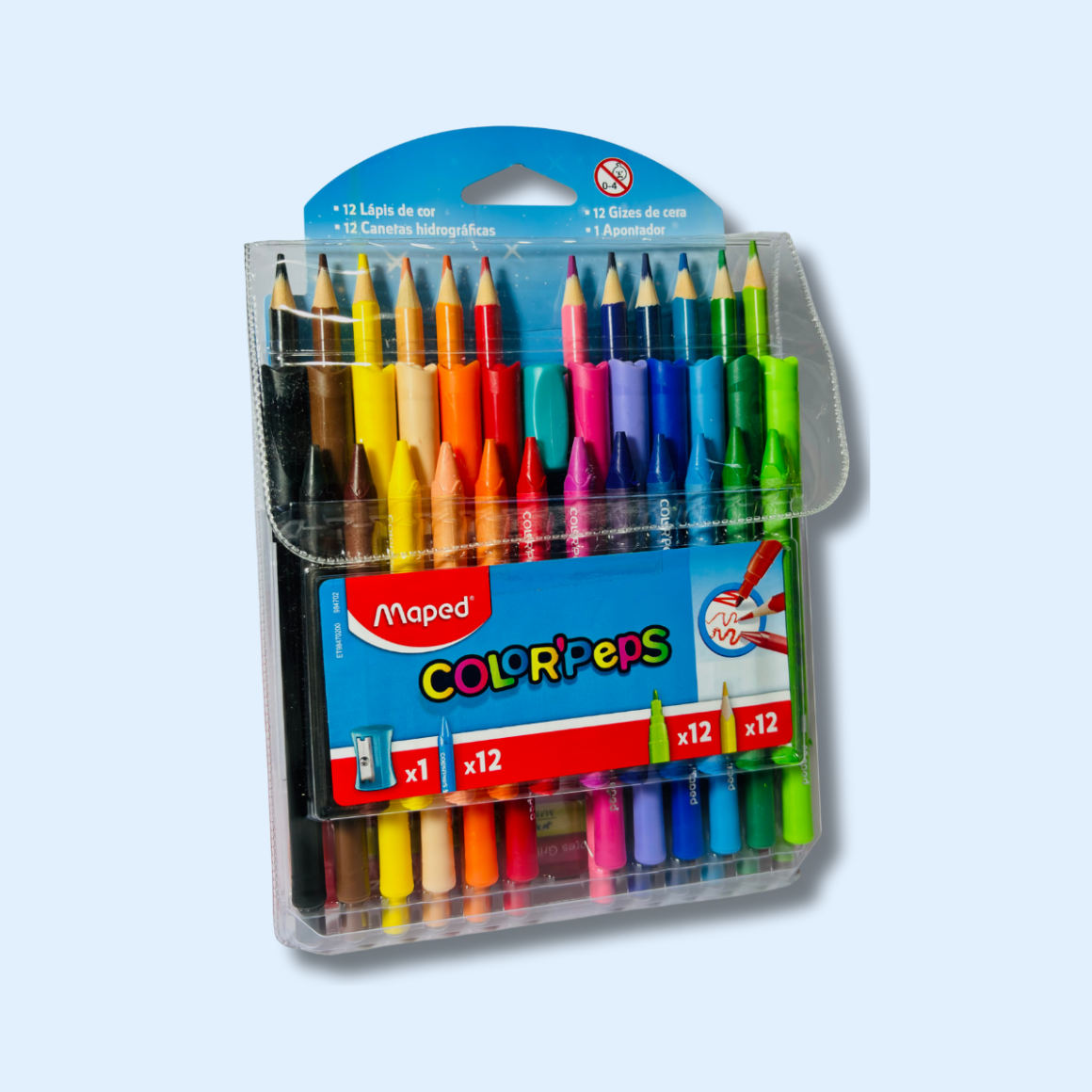 Mais cor, mais diversão e tudo em um só kit. O conjunto artístico Maped Color’Peps é perfeito para quem ama desenhar, pintar e criar. Com 12 lápis de cor, 12 giz de cera, 12 canetas hidrográficas e 1 apontador, ele oferece variedade e praticidade para acompanhar a imaginação dos pequenos — ou dos apaixonados por papelaria.