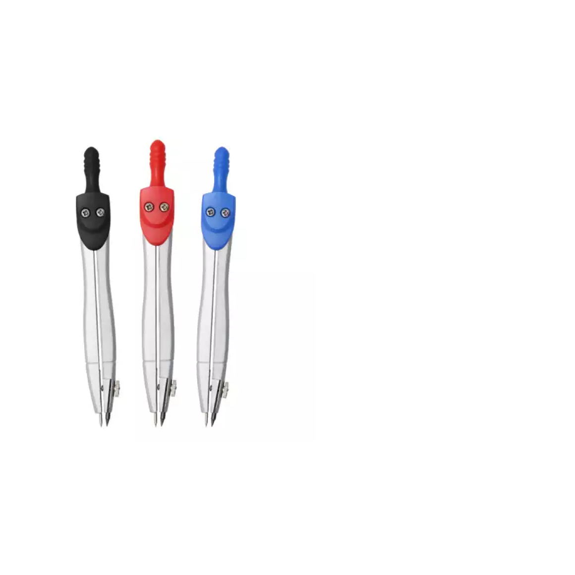 possui uma ponta seca em forma de agulha de metal para fixar o ponto central no papel; na outra, uma ponta de