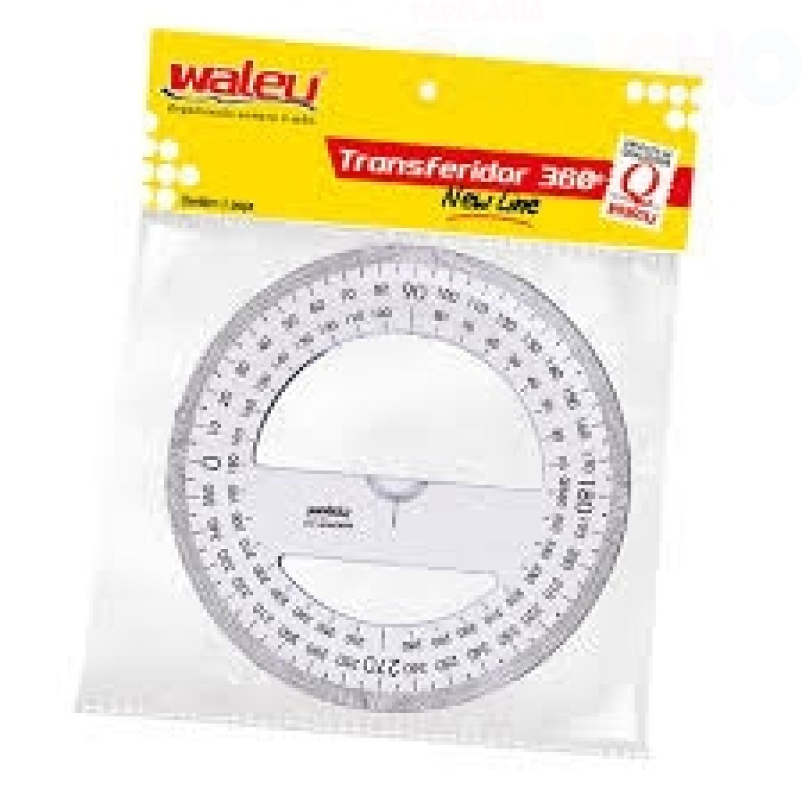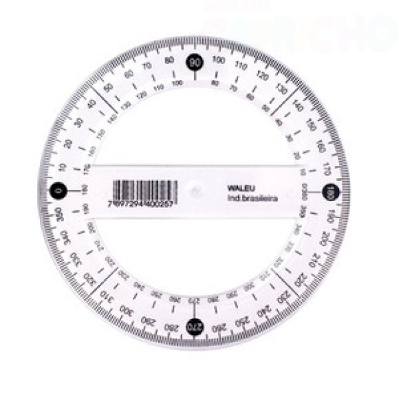 O transferidor 360º chanfrado Waleu, é resistente, tem 1,6mm de espessura, feito em poliestireno e perfeito para medições e realização de trabalhos escolares.